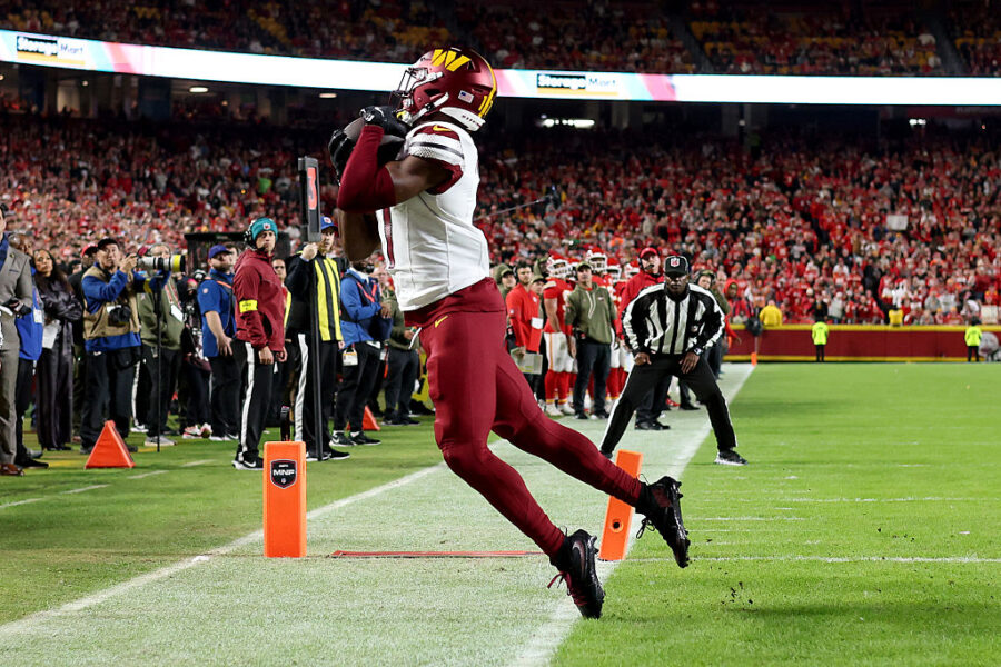 KANSAS CITY, MISSOURI – OCTOBER 27: Terry McLaurin #17 of the Washington Commanders catches an 11 yard touchdown pass against the Kansas City Chiefs during the second quarter in the game at Arrowhead Stadium on October 27, 2025 in Kansas City, Missouri. (Photo by Jamie Squire/Getty Images)