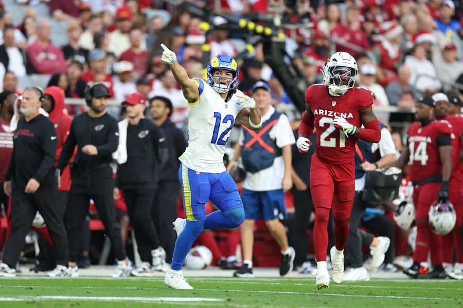GLENDALE, ARIZONA – DECEMBER 07: Puka Nacua #12 of the Los Angeles Rams reacts after a first down catch against the Arizona Cardinals during the second quarter at State Farm Stadium on December 07, 2025 in Glendale, Arizona. (Photo by Chris Coduto/Getty Images)