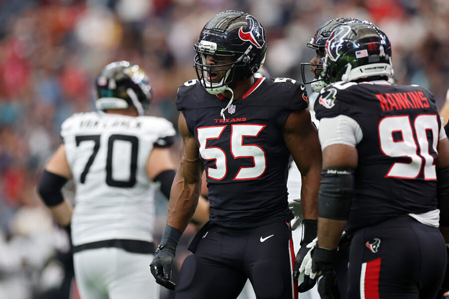 HOUSTON, TEXAS – NOVEMBER 09: Danielle Hunter #55 of the Houston Texans celebrates a sack against the Jacksonville Jaguars during the second half in the game at NRG Stadium on November 09, 2025 in Houston, Texas. (Photo by Tim Warner/Getty Images)